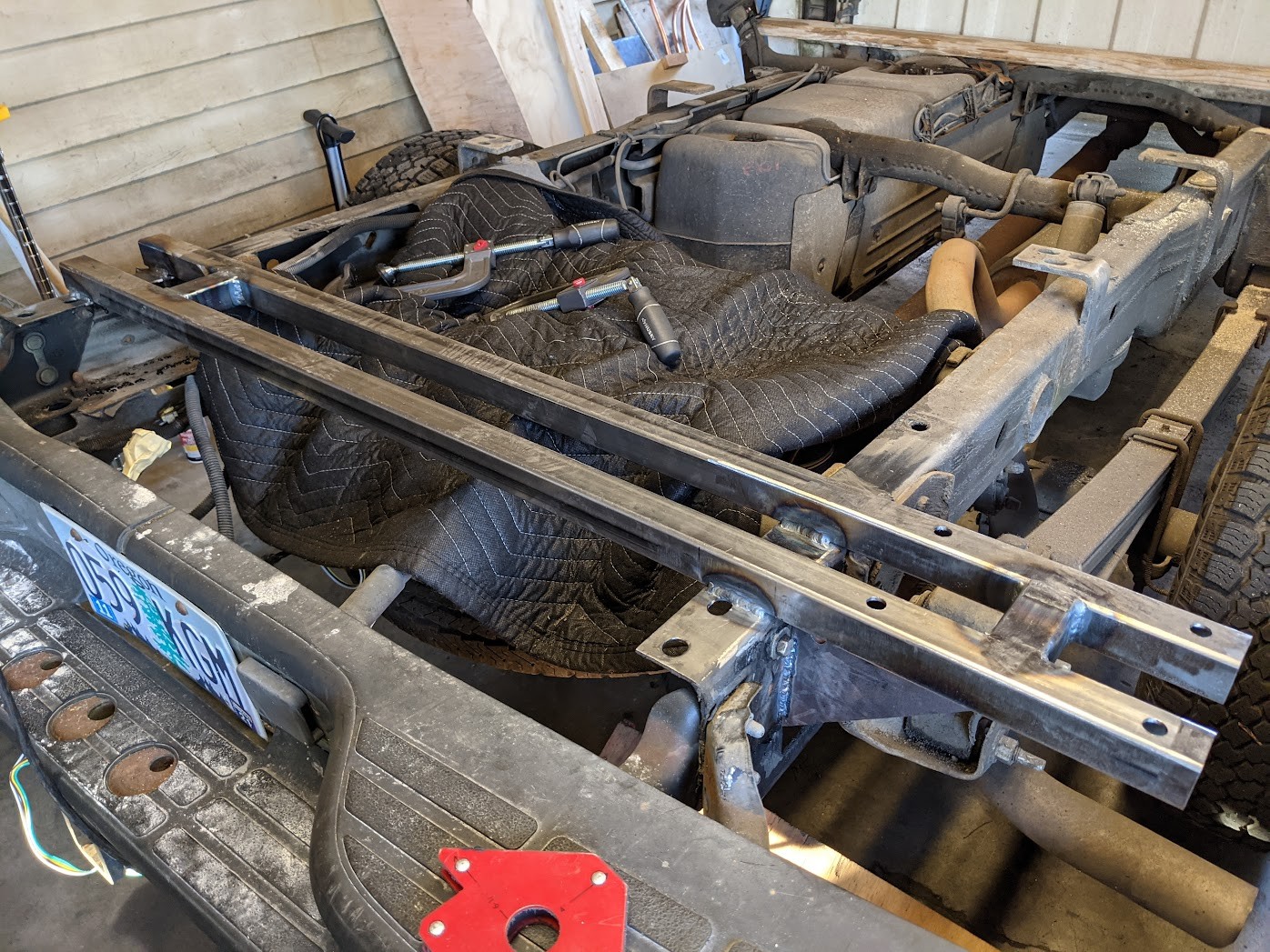 A client needed to add a crane to his work truck to support his stone sculpting business. I designed and welded this sub-frame to support the crane